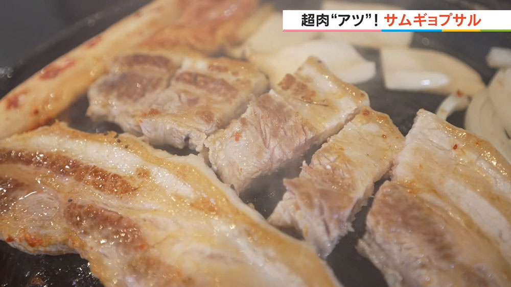 分厚い豚バラ肉は鉄板の上で頻繁に返さず、じっくりと焼くのがコツです。