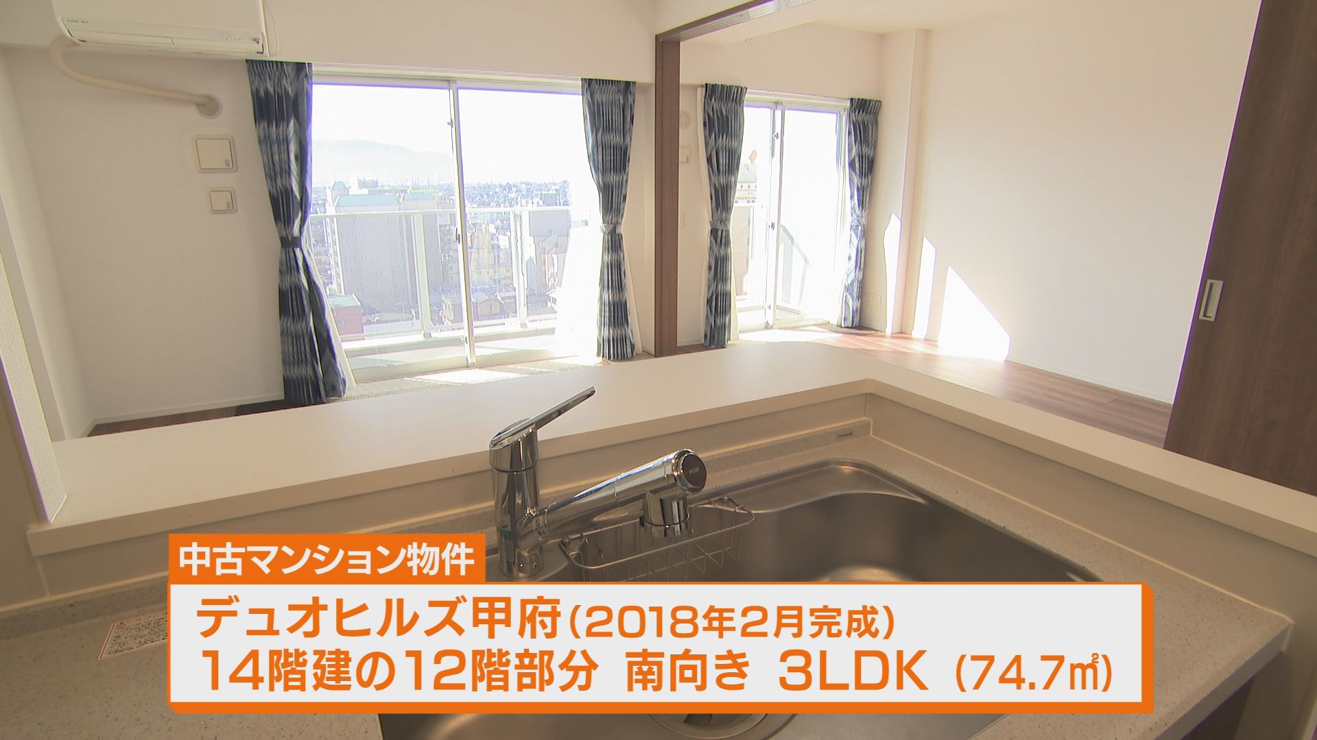 2018年2月に施工されたこのマンション、12階のエレベーターホール前南向きの3LDK。 リビングからは甲府盆地や富士山、南アルプスが見える。キッチンからも料理をしながら眺望を楽しむことができる。 2月7日現在で3200万円で売り出し中。
