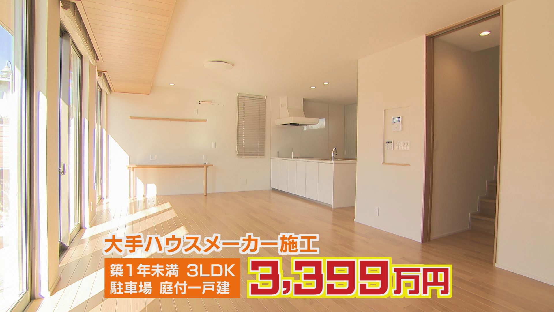 LDKは22帖の広さがあり、調光機能付き間接照明を備えている。キッチンカウンターはI型のオープンタイプで視界も良好。階段下を有効利用したパントリーもあり、収納力もある。 様々な機能がそこかしこにみられる建物と、4台置ける駐車スペース、芝生の庭と半畳の家庭菜園が付いている。