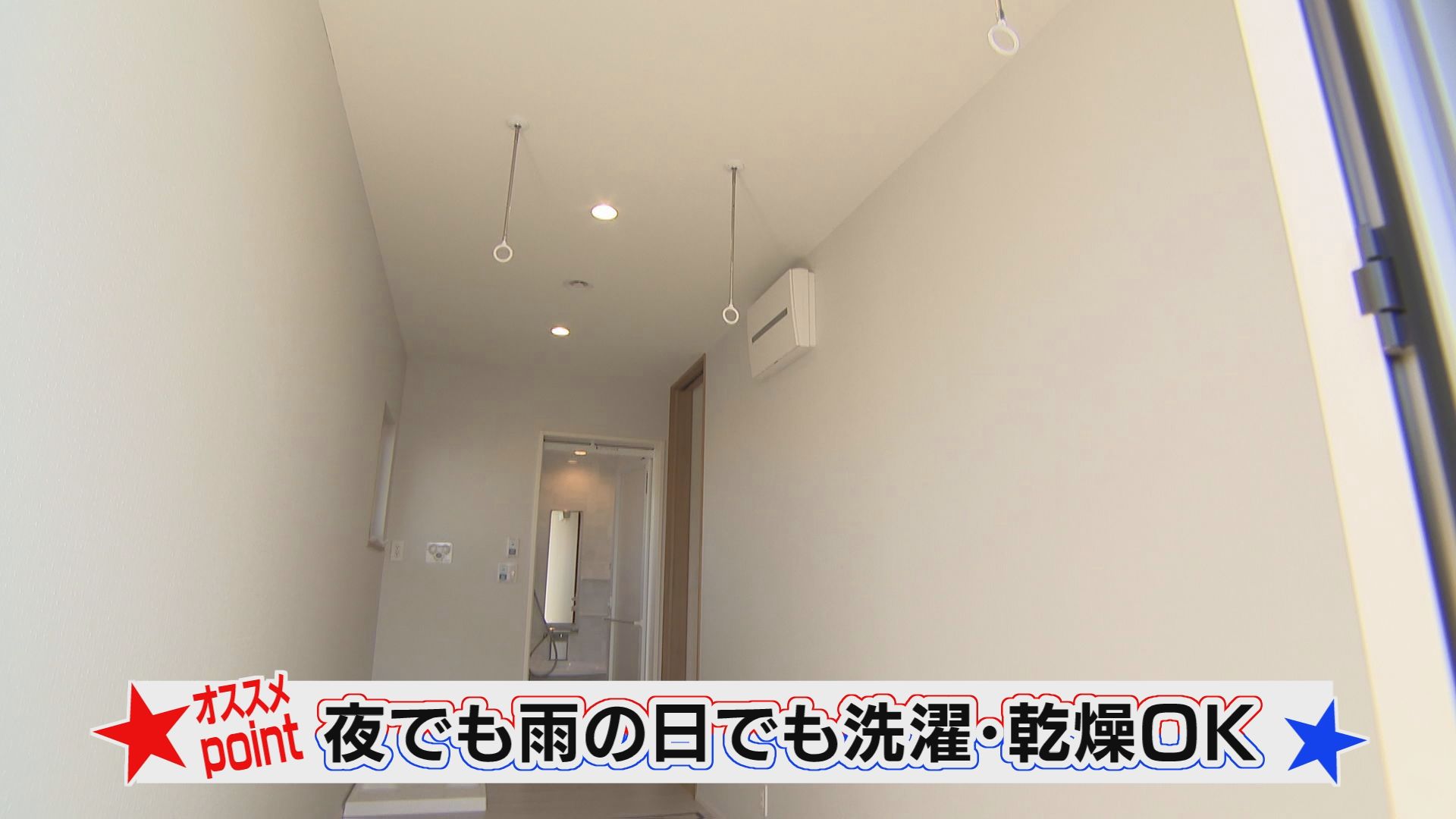 2階に浴室を持ってきたことにより、洗濯スペースも2階へ。脱衣所を兼ねたこのスペースは、室内物干しが付いているため、大量の洗濯物を室内乾燥できる。バルコニーにも物干しは設置できるが、室内であれば夜でも雨でも気にせずに干せ、花粉や花粉や埃が着く事もない。