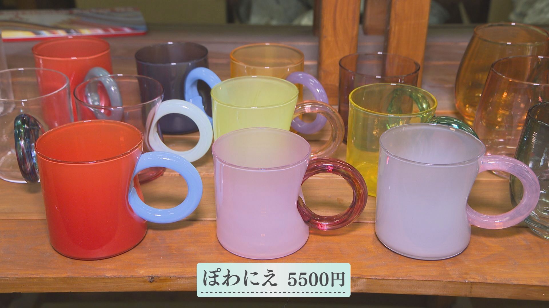 『ぽわにえ』はフランス語で"ハンドル"の意味。 ガラスのコップに、ガラスのハンドル(取っ手)がめり込んだ作品。 この形になることで、バランスがよく持ちやすいコップになるんだとか。
