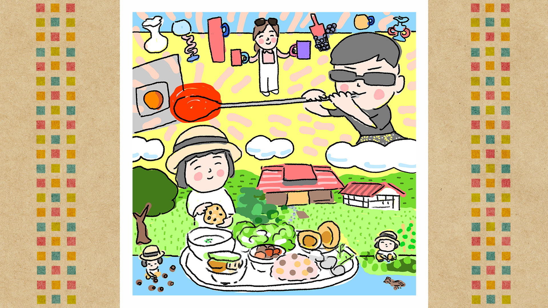 『ハラペコベリエ』の長町さんのガラスの器と、 居心地のよい池松さんの『Cafe三ツ葉』を描きました。 ポイントは、太陽のような熱々のガラスです。 矢部太郎