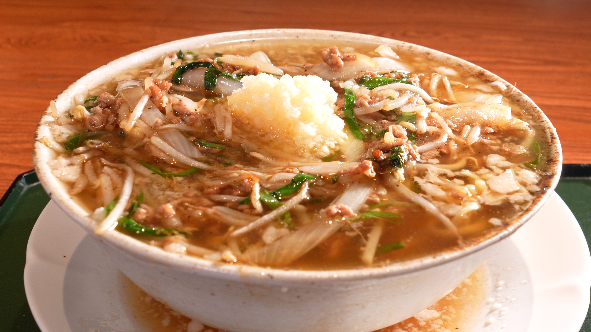 背脂たっぷりの醤油ラーメンに、玉ねぎ、ひき肉、ニラなどを炒めて仕上げた餡掛けがたっぷりのったスタミナラーメン ニンニクたっぷりでビジュアルも抜群な一杯