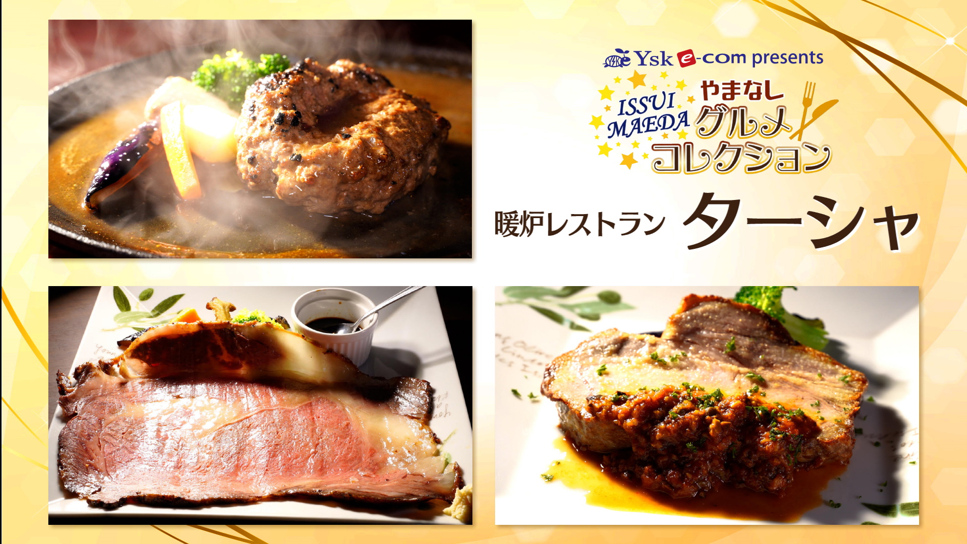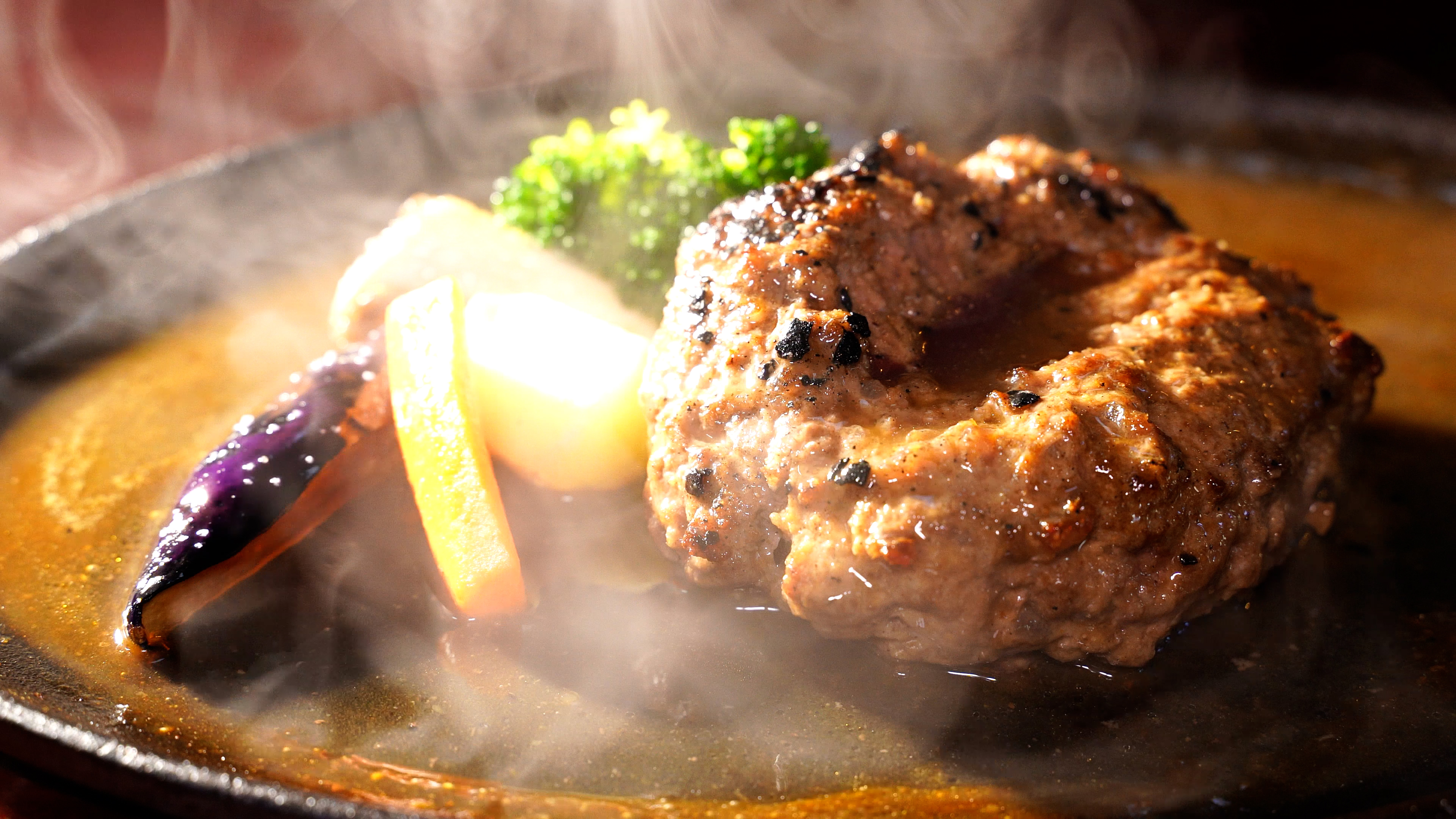 メニューはコース提供のみ まず最初に頂いたのは、和牛100%ハンバーグステーキ! 薪火で表面をジュワッと焼いてオーブンで仕上げます 隠し味に醤油を使ったシェフ特製のデミグラスソースを熱々の鉄板にかけて出来上がり! これはトレビアン!