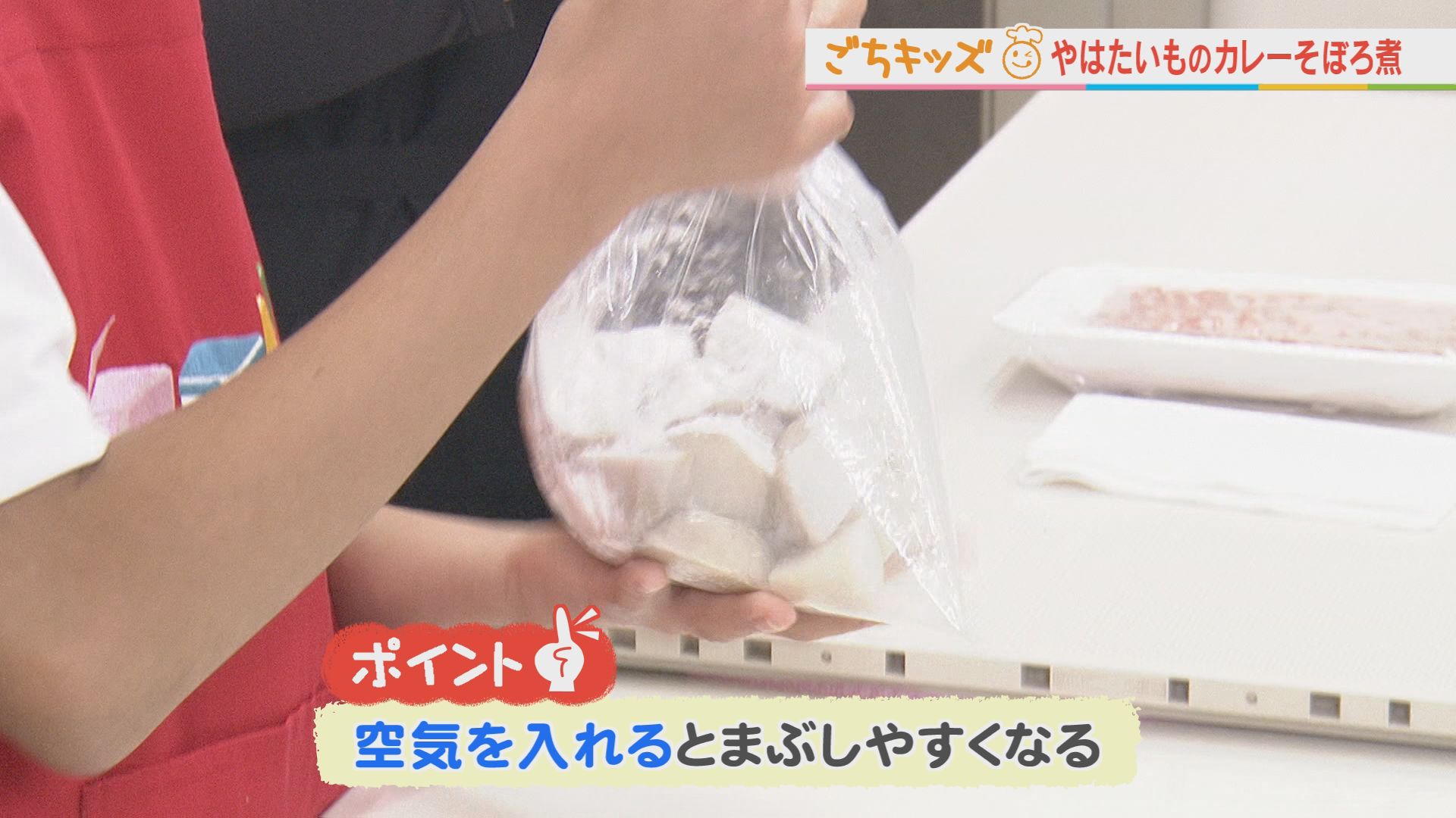 やはたいもは食べやすい大きさに切って、ポリ袋に入れる。 片栗粉(大さじ1.5)を入れて、振ってよくまぶす。