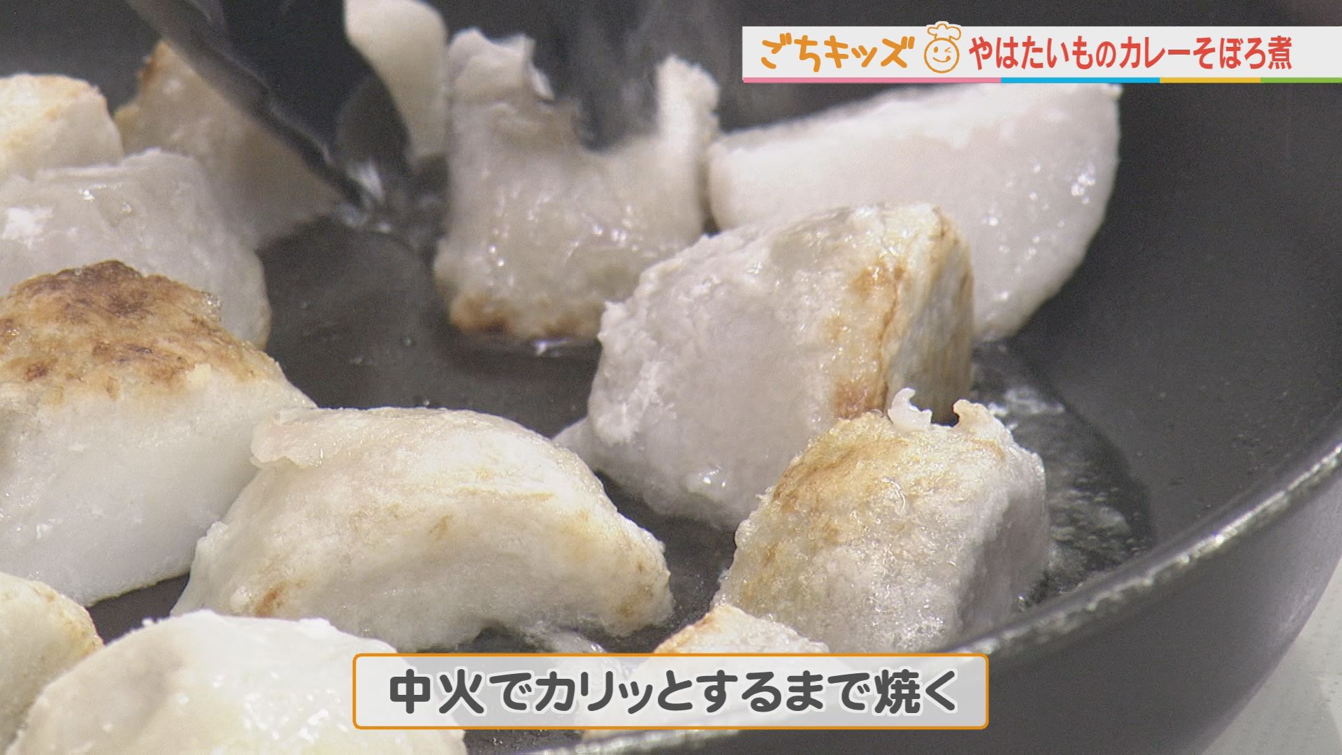 サラダ油を入れ、中火でやはたいもを焼く。 焼きあがったら一度皿に取り出しておく。