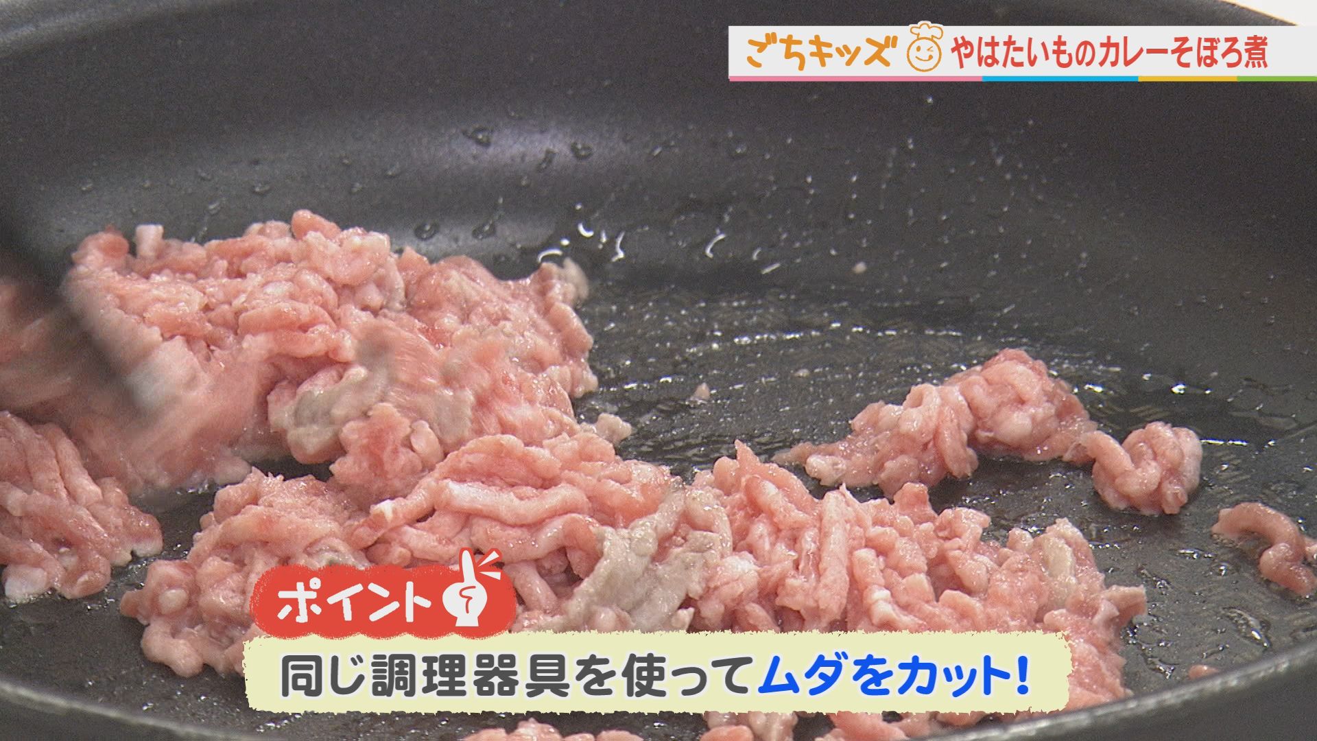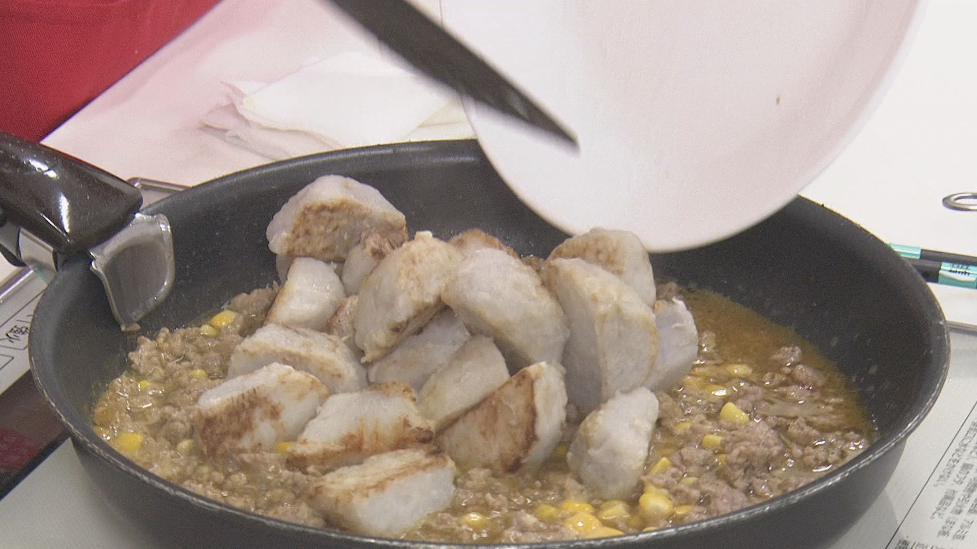 やはたいもを焼いたフライパンでひき肉を炒める。 火が通ったら、混ぜておいた調味料(コンソメ・みりん・カレー粉・しょうゆ・トマトケチャップ・砂糖・水)とコーンを入れて軽く沸騰させる。