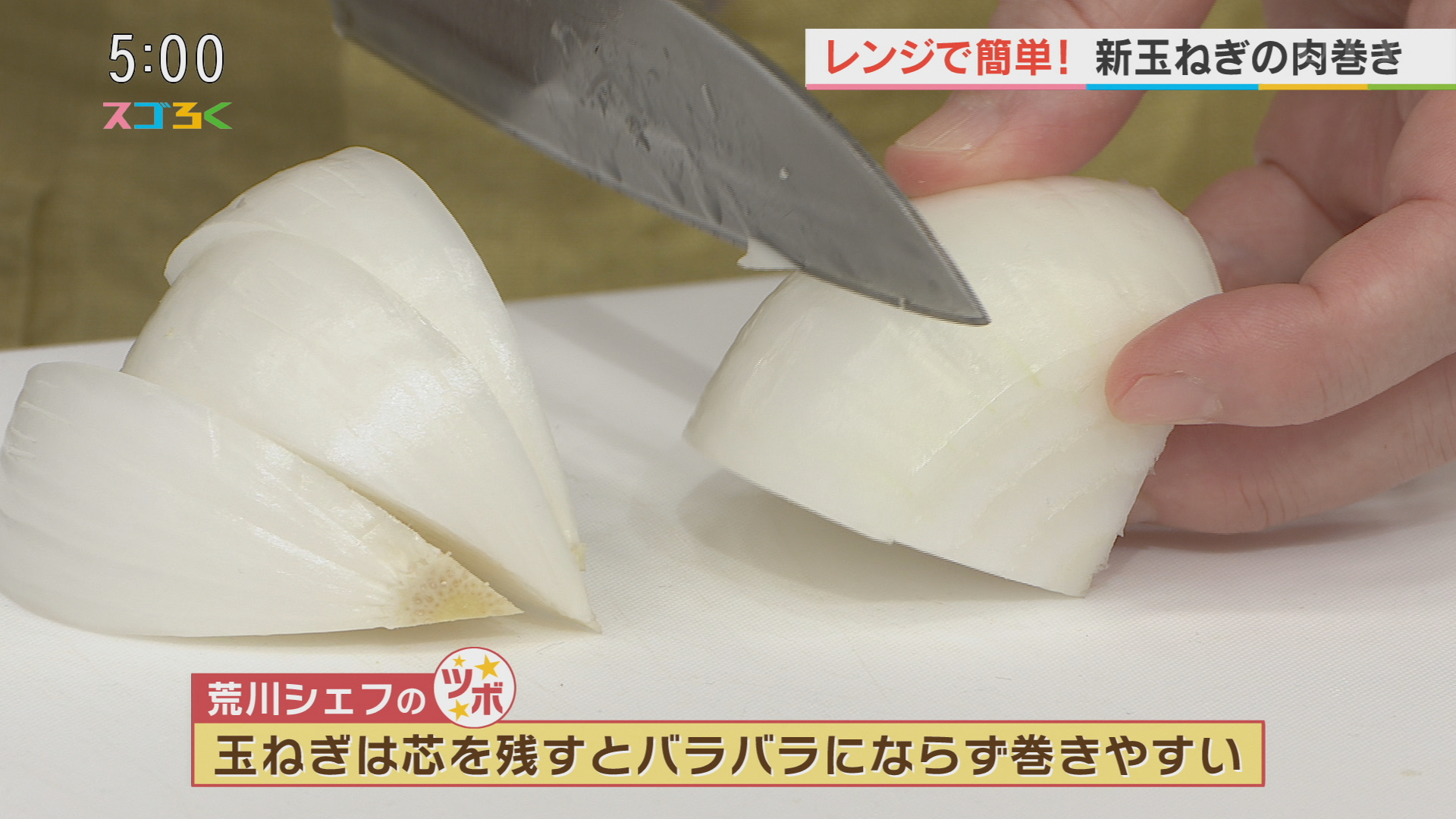 新玉ねぎを芯を残して6等分にカットする 【荒川シェフのツボ】 芯を残すことで玉ねぎがバラバラにならず巻きやすい! さらに新玉ねぎなら芯も柔らかいので美味しくいただけます! プロセスチーズは半分にカット 豚肉の片面に塩をふり新玉ねぎとプロセスチーズをきつく巻く