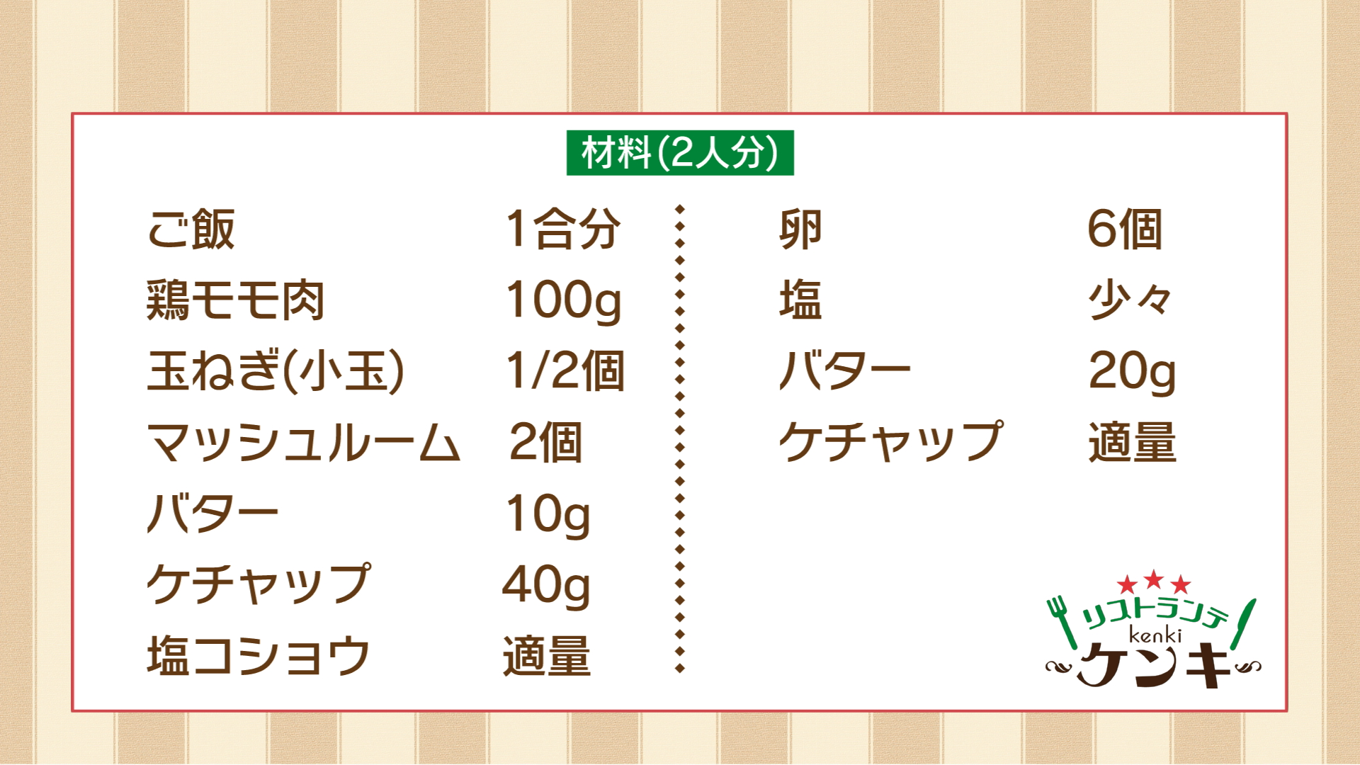 ・よく熱したテフロンパンにバター10gを加え 軽く溶けたら中火に戻す ・卵を半量入れよくかき混ぜる ・ほどよくフワっとなったら 卵にふれずに3秒ほど火を入れる ・火からおろしチキンライスを半量いれゴムベラで成型する ・包めたらフライパンの端に寄せお皿に返しながらのせる ☆ツボ☆ 【火を止めてからゆっくり成型すれば失敗しにくい】 最後にケチャップをかけて完成!