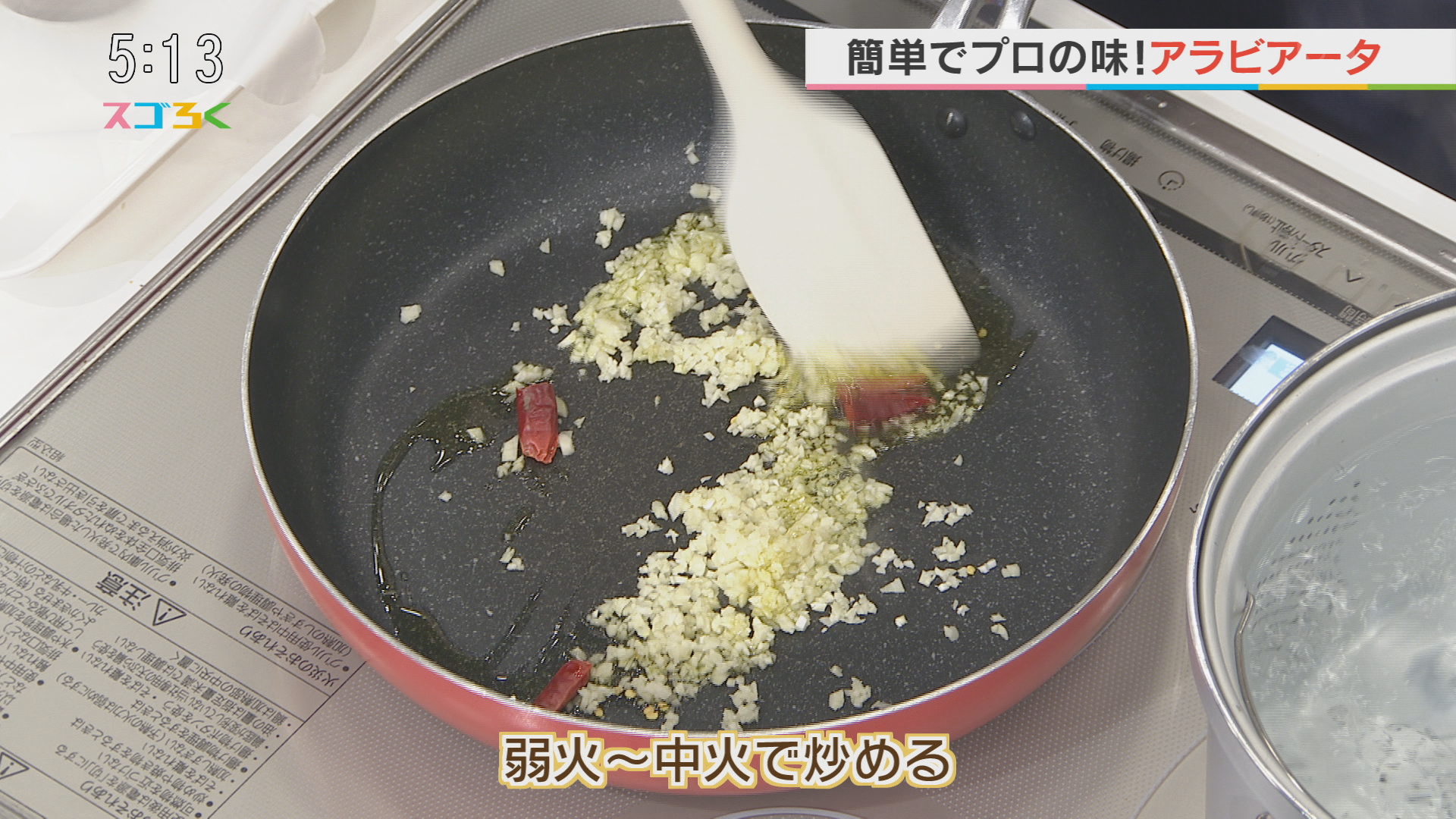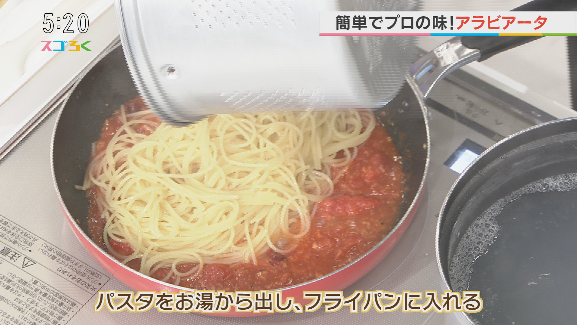 ・スパゲッティ-ニがアルデンテになったら、フライパンに入れる ・エクストラバージンオリーブオイルを入れる