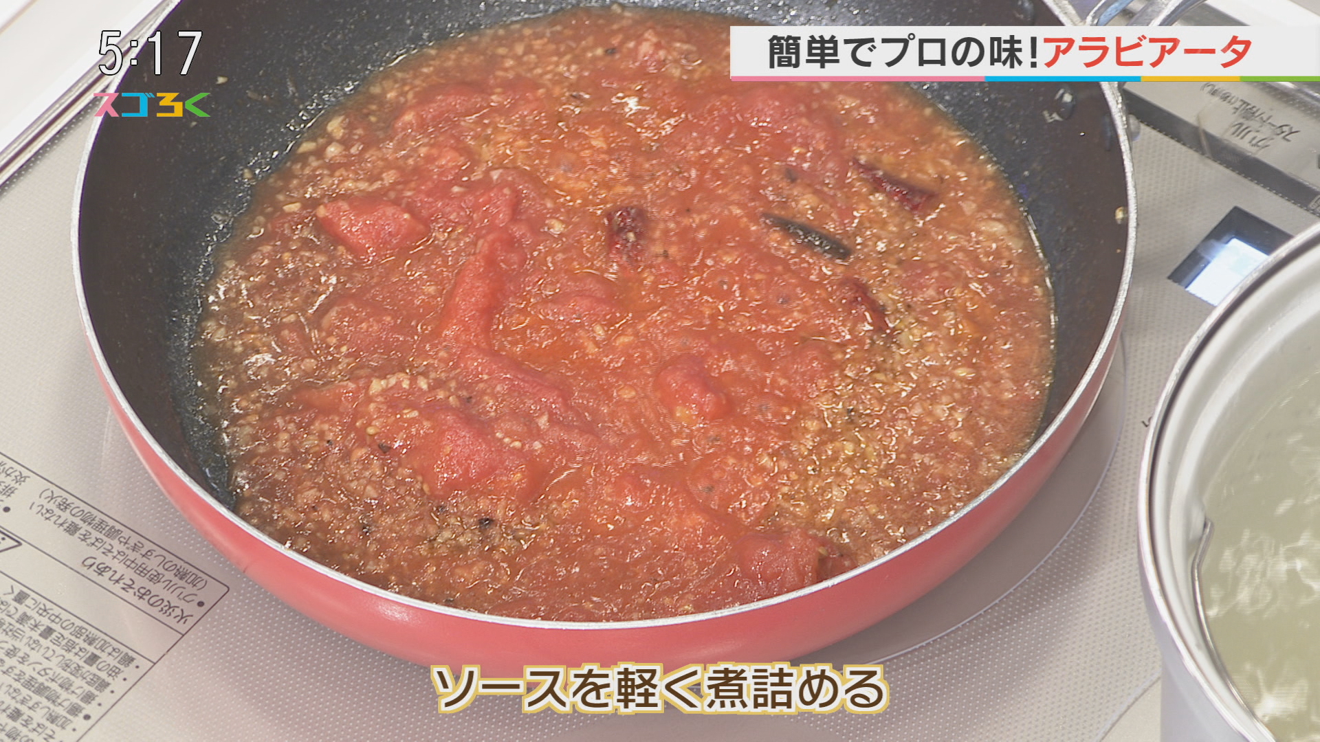 ・ニンニクの焦げを抑えるため、パスタの茹で汁を入れる ・ホールトマトを軽く潰して、フライパンへ ・砂糖、塩を入れて軽く煮詰める