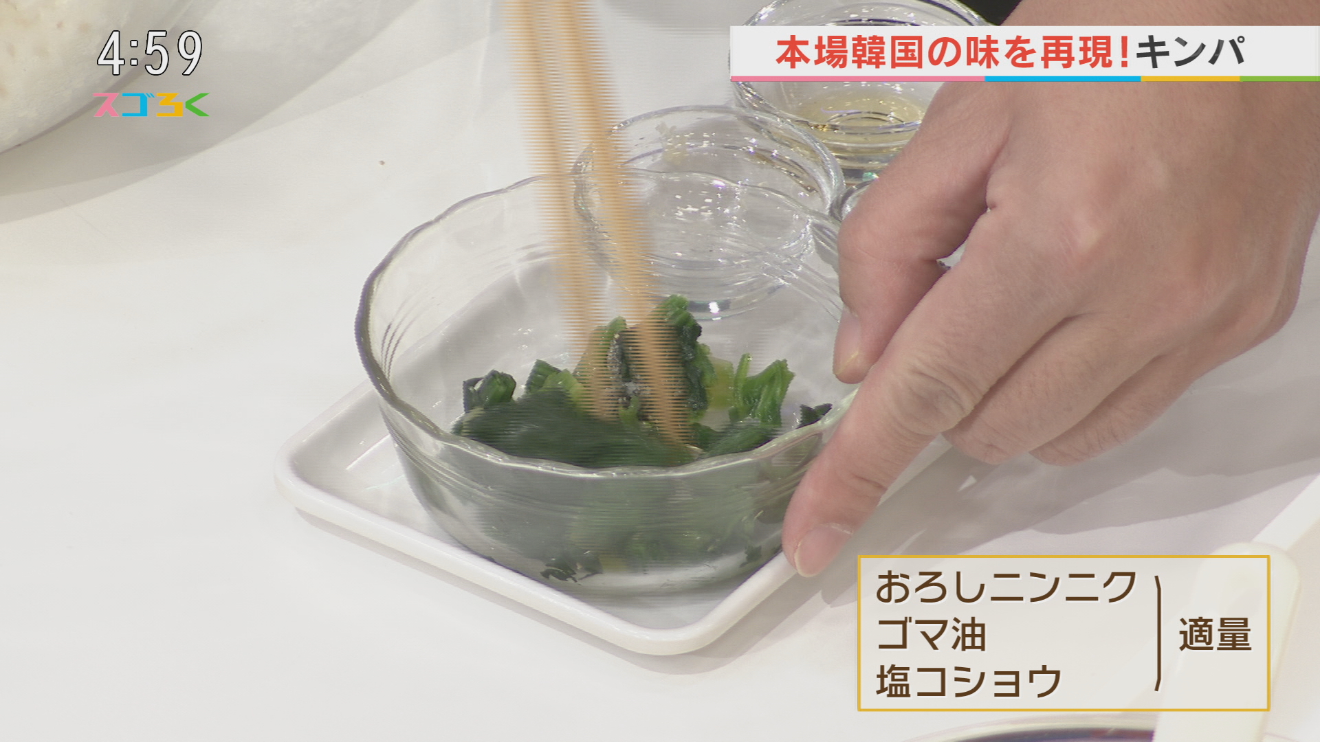 ●塩ゆでしたほうれん草にニンニク、ゴマ油、塩コショウを入れて和える