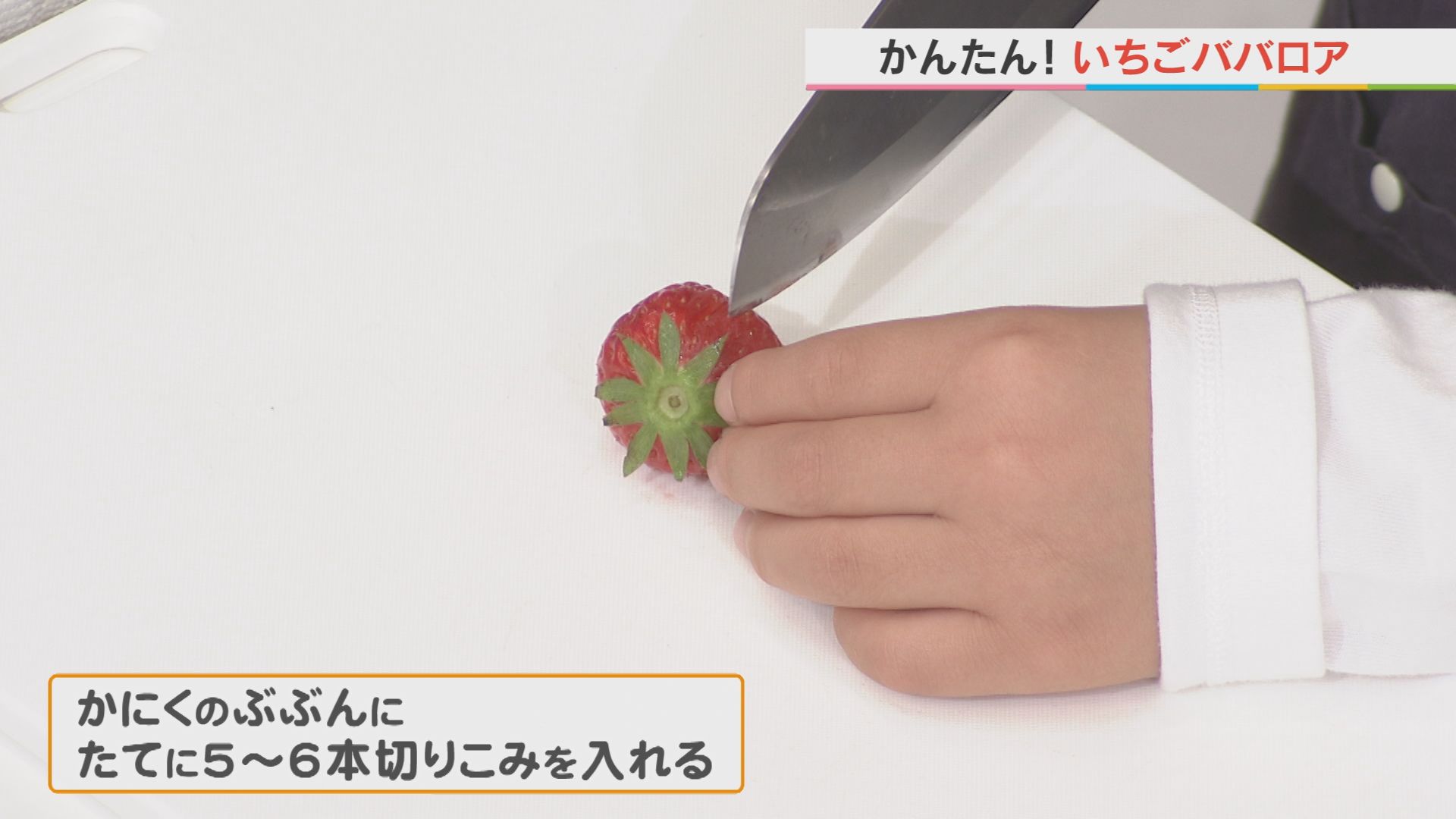 ⑥飾り用のいちごは葉をつけたまま果肉の部分に縦に5,6本切り込みを入れて少しずらす