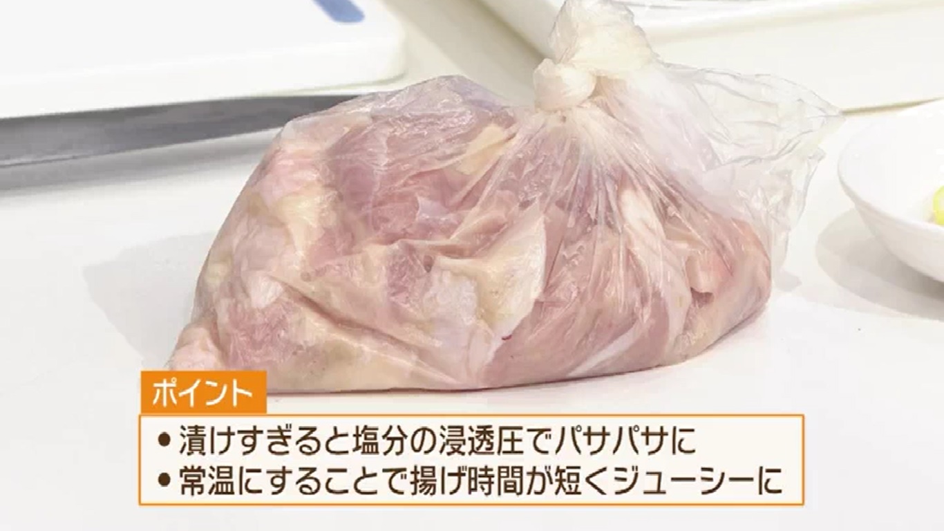 ・鶏もも肉は50gずつくらいにカット ・袋の中にカットした肉とすりおろしにんにく、 すりおろし生姜、白だし、レモン汁を入れ 常温で10分漬け込む ☆小池シェフのツボ☆ タレは漬け込みすぎない ➡漬け込みすぎると塩分の浸透圧で パサパサになる原因に! 肉を常温にすることで揚げ時間を 短く済ませ、ジューシーに仕上げられますよ