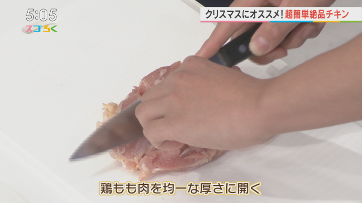 30分~1時間程、常温に戻した鶏もも肉を均一な厚さになるように包丁で開いて、塩を軽くふっておく。
