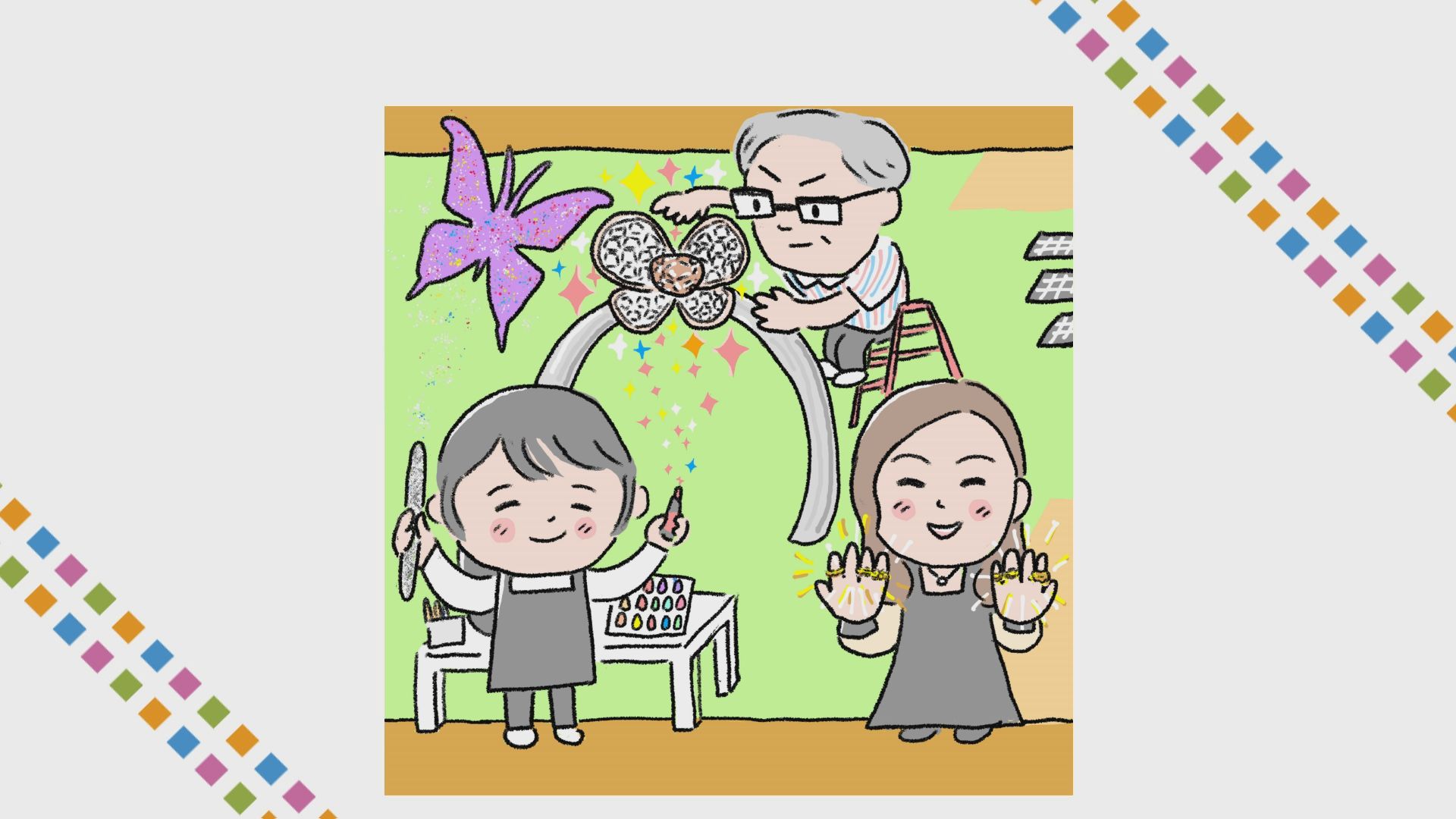 ハンドケアやボディジュエリーを体験させていただいたお礼に、キラキラパウダーで描いたイラストをプレゼント。漫画とは違った難しさはありましたが、見事描き上げました。