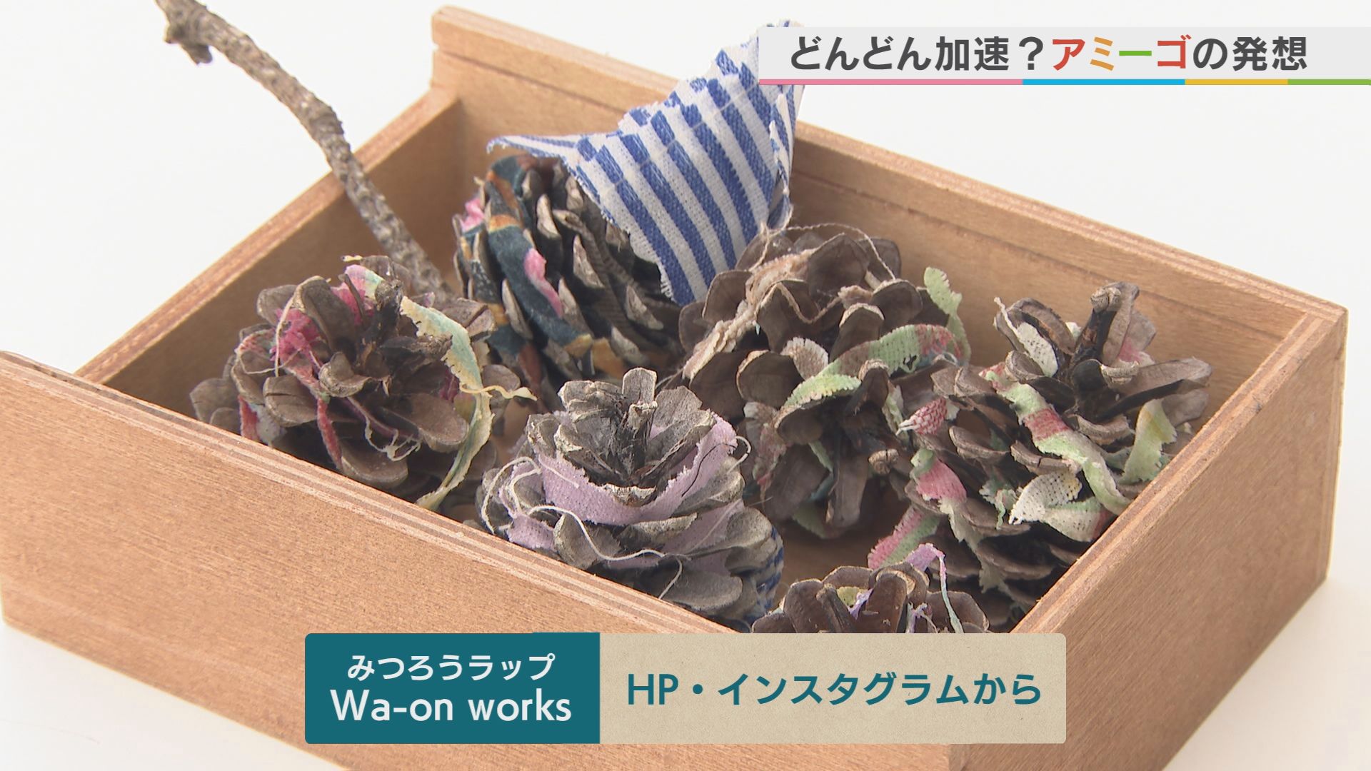 須藤さんは、まだまだアイディアがいっぱい! 商品を作る時に出る みつろうがついた端切れ。 これを松ぼっくりに巻くと より火がつきやすい着火剤に! 自然由来のものだけなので、 火をつけた時の匂いも気にならず 何よりエコなアイディアグッズです!