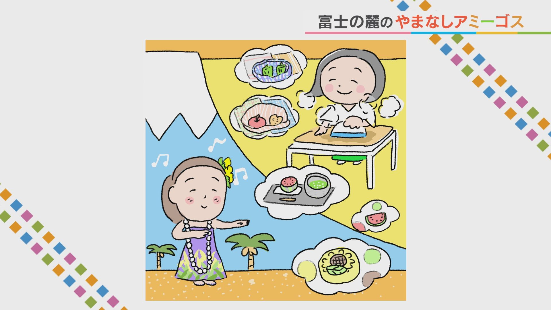 富士山の麓で、アクティブに多彩に 暮らしている青山さん・須藤さんを カラフルにイラストに描きました。 イラストの富士山が 半分しか描かれていないのは… 次回のアミーゴのイラストで解明されますよ。 ぜひ、「やまなしアミーゴス」の インスタをフォローして そのワケを見てください♪