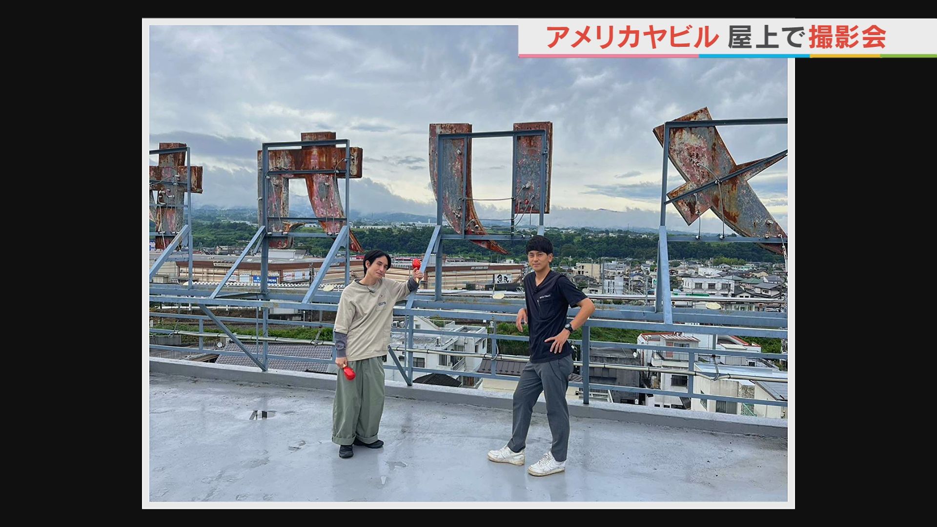 建設当時から残る外階段をあがると 開放感いっぱいの屋上へ。 晴れた日には富士山も眺められる ビューポイント! *立ち入りは、IROHA CRAFT事務所から。 なんとも古めかしい「アメリカヤ」の 看板をバックに カッコつけて撮ってみました(笑)