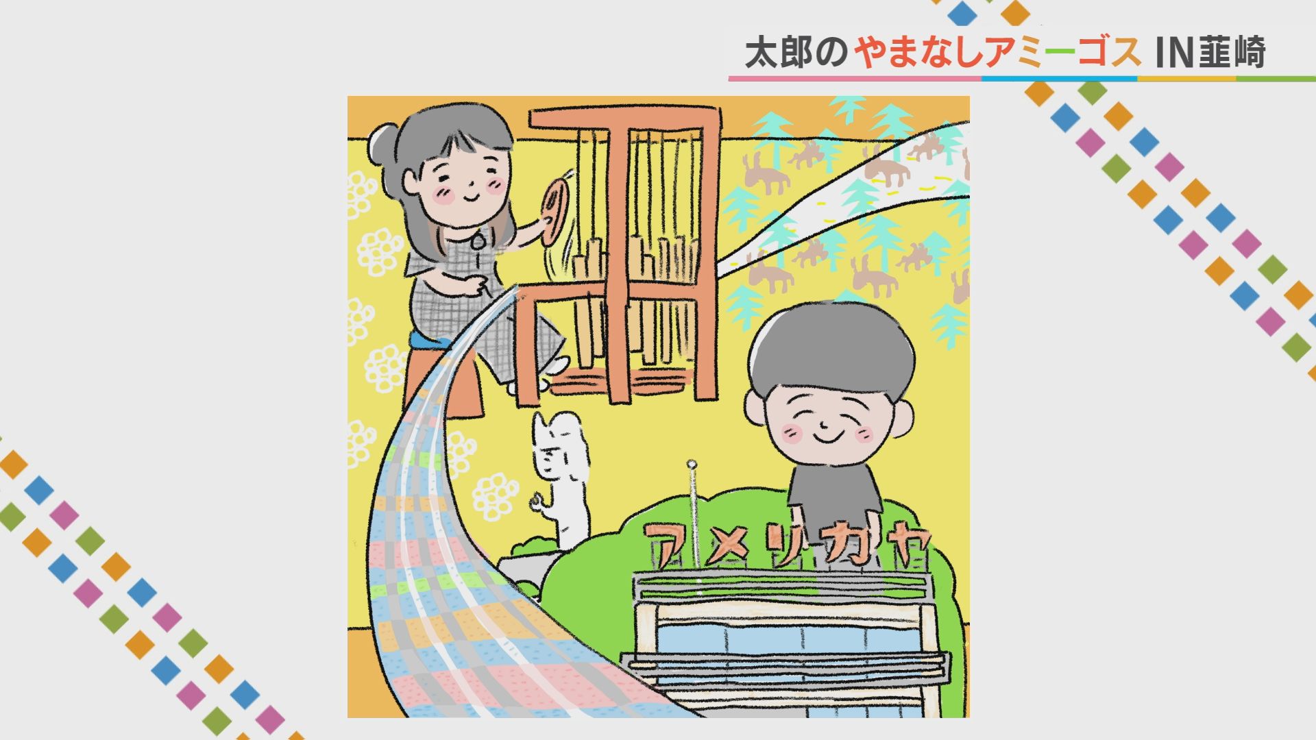 今日のイラストは… アメリカヤの屋上に立つ IROHA CRAFT 長田さんと、 機織りをする堀田さんを 堀田さんのテキスタイルデザインを ちりばめて描いてみました! ポイントは、後ろから見守っている 平和観音です。 矢部太郎