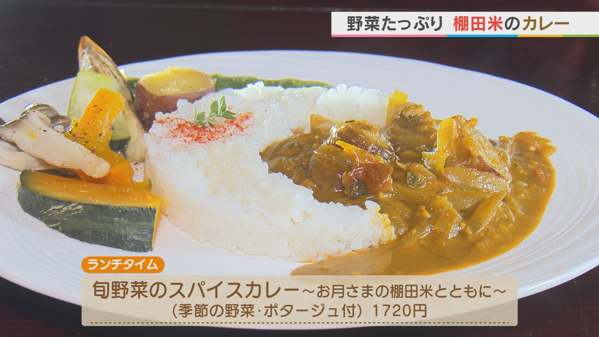 カフェのメニューは 肉や魚介を使わない 植物性のもの。 畑でとれた旬の野菜を ふんだんに使った スパイスカレーの真ん中には 三日月が。 目の前に広がる棚田の お米が使われています。
