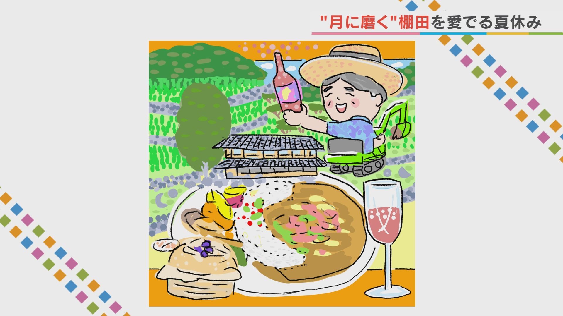 美しい棚田と 棚田米を使った スパイスカレーと お母さんのむしパンを 描きました。 ポイントは ユンボを操縦する渋谷さんです。 太郎